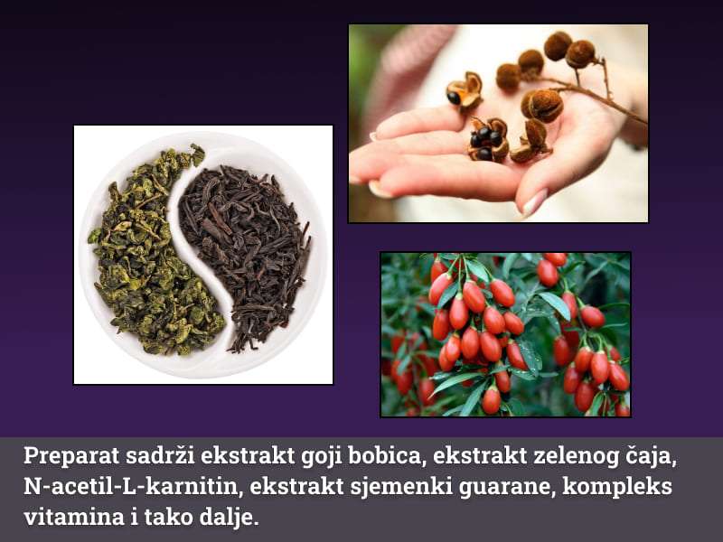 Ono što me najviše zanimalo kod proizvoda bila je neobična kompozicija. Proizvod sadrži ekstrakt goji bobica, ekstrakt zelenog čaja, N-acetil-L-karnitin, ekstrakt guarana sjemenki, vitaminski kompleks i tako dalje.